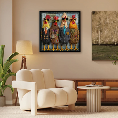 Each rooster rocked a different retro suit, sunglasses on, hands in pockets. One had a bright orange tie, another a green shirt, and one even had a jacket plastered with tiny flowers.